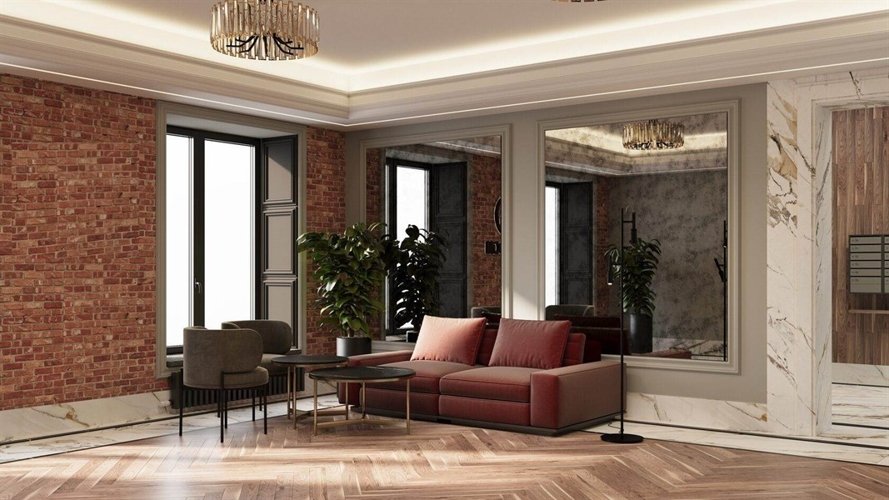 Ощущается атмосфера винтажного особняка, отделка из дерева и керамогранита, высокие потолки. Для вашего комфорта тут расположена зона ресепшен с консьержем, предусмотрено уютное общественное пространство для отдыха и вместительная колясочная.