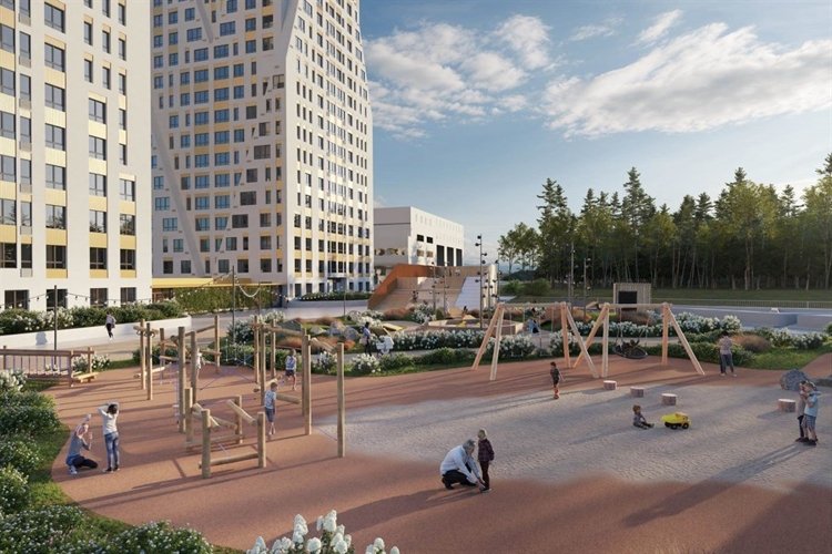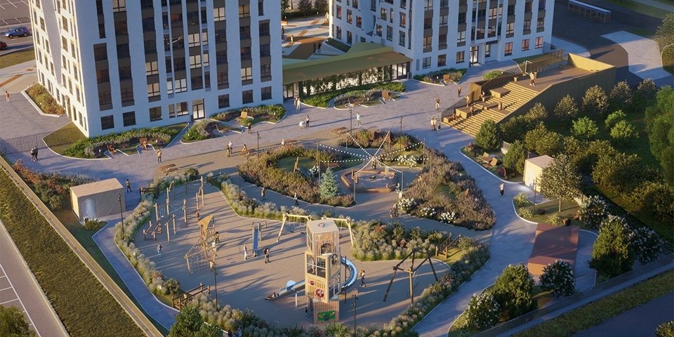 Во дворе нет машин, а газоны и аллеи делят его на удобные уровни. Эстетику двора создают фотогеничный арт-объект и ландшафтные элементы.