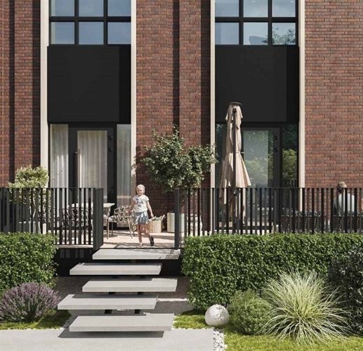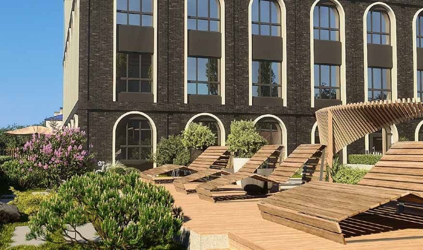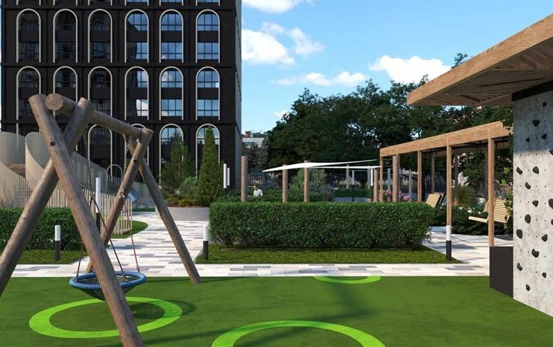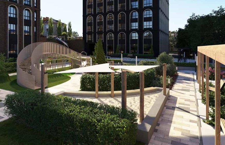 Озеленение играет ключевую роль в создании атмосферы, а оборудование природных оттенков добавляет камерности и уюта. Двор будет выглядеть привлекательно в любое время года, не теряя актуальности.